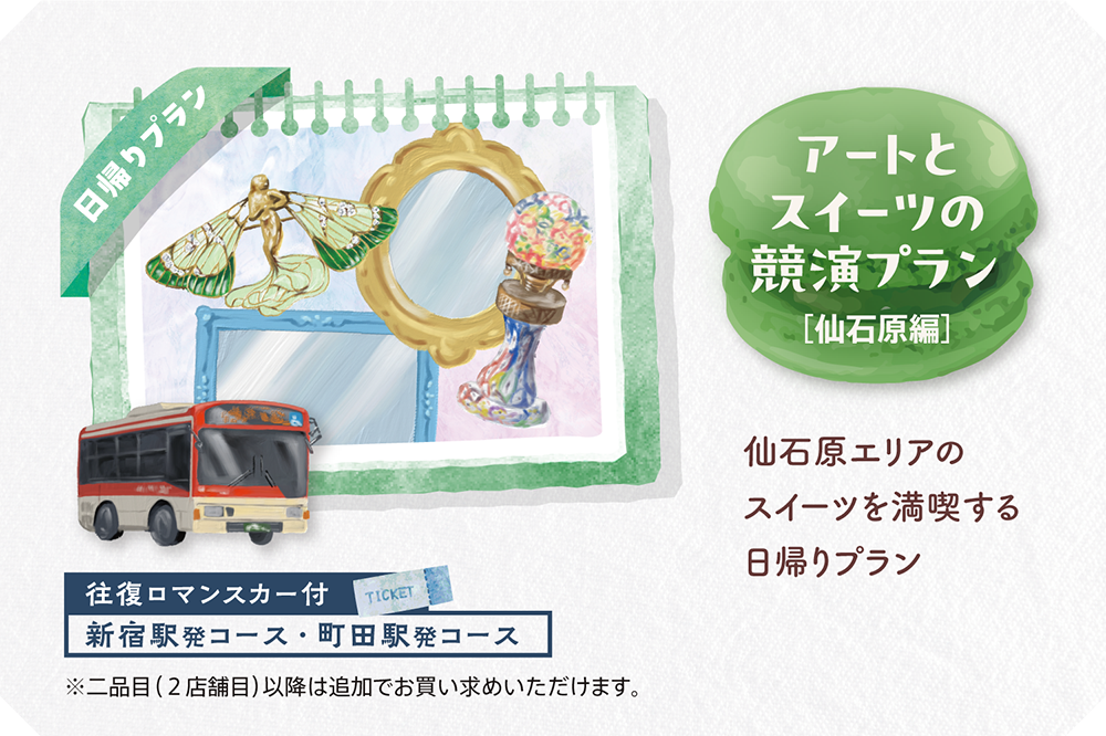 スイーツのご予約と新宿駅または町田発着往復の特急ロマンスカー・乗車券がセットになった日帰りプラン、さらには箱根の4つのエリアからお選びいただける宿泊プランもございます。