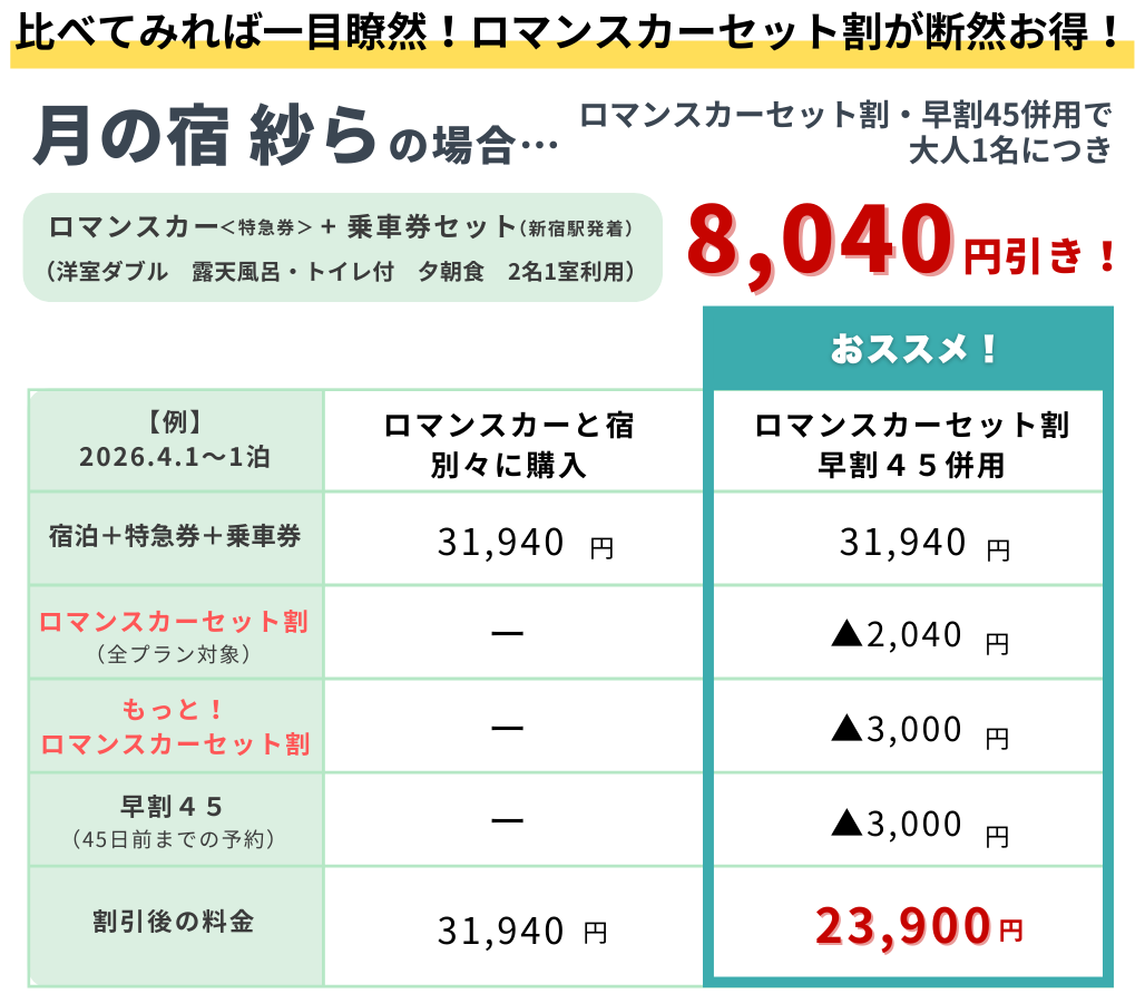 「ロマンスカーセット割」は全宿が割引対象!ロマンスカーと宿をセットで予約すればすべての宿が1人あたり最大2,040円割引に。