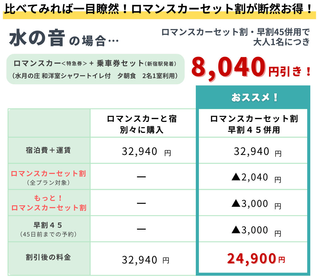 さらに【もっと!ロマンスカーセット割】対象宿で早割を利用すれば、1人あたり最大8,040円割引、2人で1泊最大16,080円以上お得!