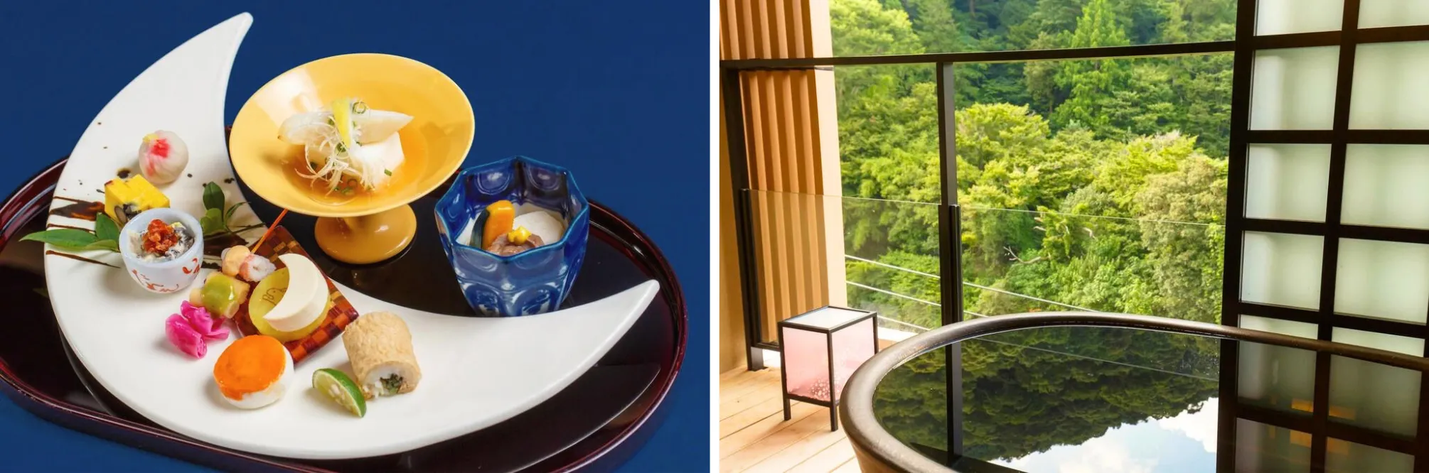 和の趣にモダンな感性を取り入れたおしゃれな館内。旬の食材を活かした新感覚会席料理は、月をモチーフにした器に盛り付けられており、見た目にも美しく、写真映えも抜群です。