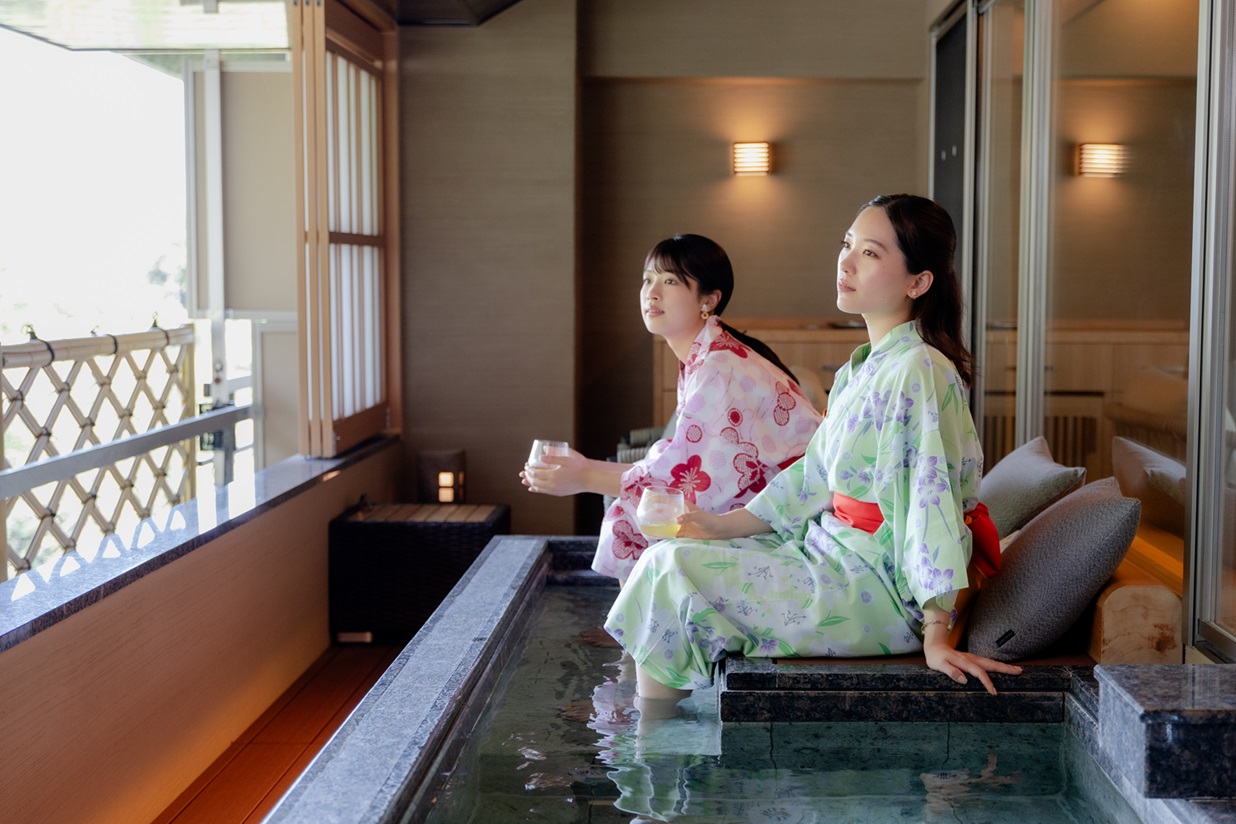 すべての客室に香り高い檜造りの天然温泉露天風呂を完備。気兼ねなく温泉を楽しめる贅沢な空間が広がります。広々とした大浴場のほか、趣の異なる3つの貸切風呂も楽しめます。