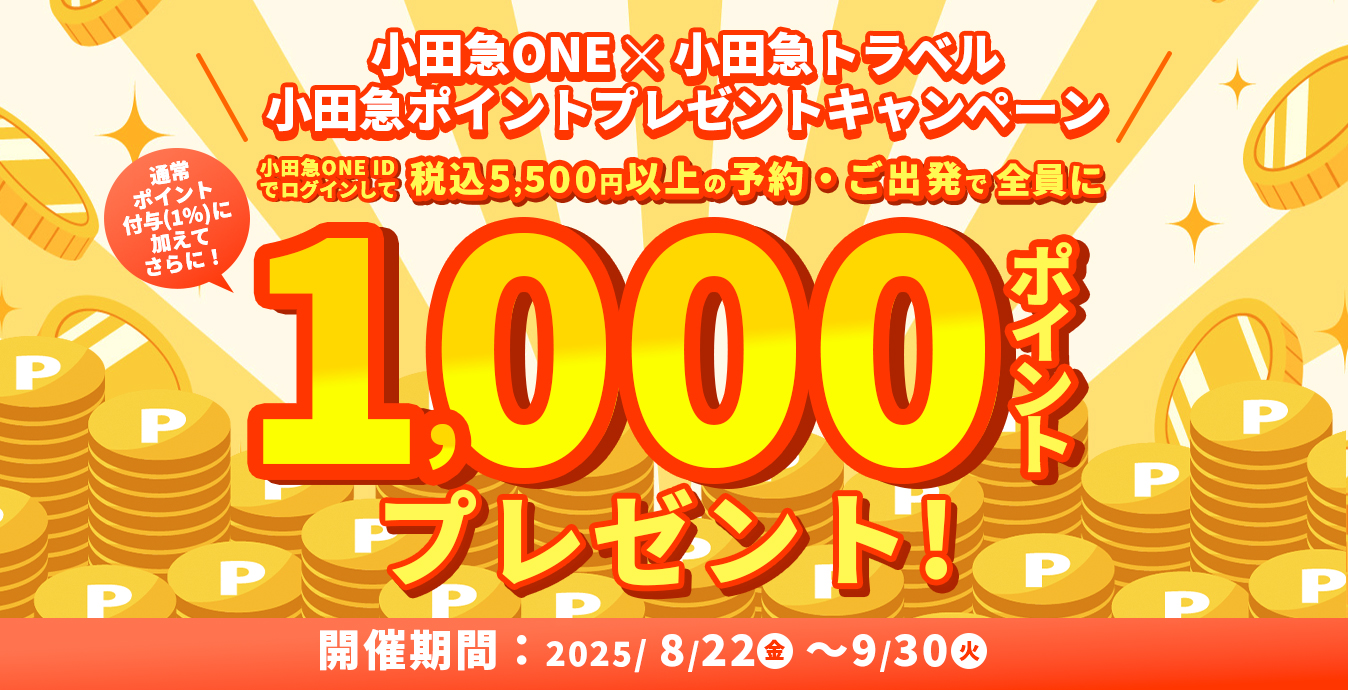8月22日(金)~9月30日(火)の期間中、予約する際に小田急ONE IDでログインの上、1予約で税込5,500円以上の商品をお申し込みの上ご出発いただくと、全員にもれなく小田急ポイント1,000ポイント分のOPギフトをプレゼント!
