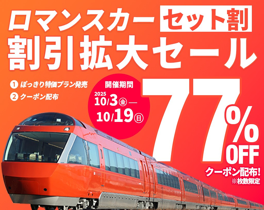 12/12(金)11:00~12/29(月)13:00までの期間限定で、小田急トラベルおすすめ宿の割引クーポンを枚数無制限で配布!クーポン併用+早割プラン+「ロマンスカーセット割」で1名につき最大10,540円割引に!宿限定クーポンは2026年3月31日(火)出発分までが対象です。