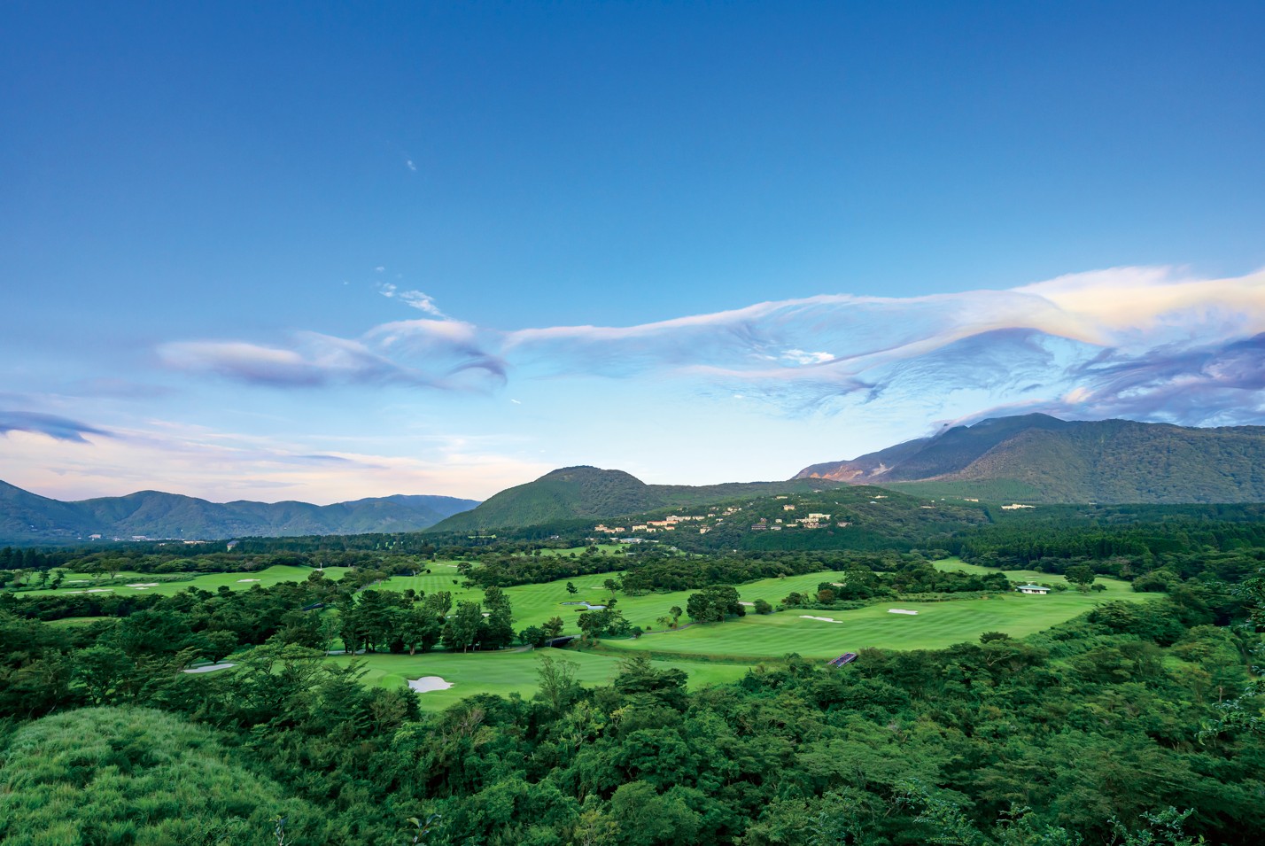 芝の緑が広がるゴルフコースの向こうには、幾重にも連なる箱根の山々が雄大なパノラマを描きます。丸岳、金時山、明神ヶ岳といった外輪山の稜線が空と接し、その内側には台ヶ岳、冠ヶ岳、神山などの中央火口丘が静かな存在感を放っています。天候に恵まれた日には、大涌谷から立ち昇る白い噴煙や陽光を映す芦ノ湖、そして空を渡るロープウェイの姿も望むことができるでしょう。