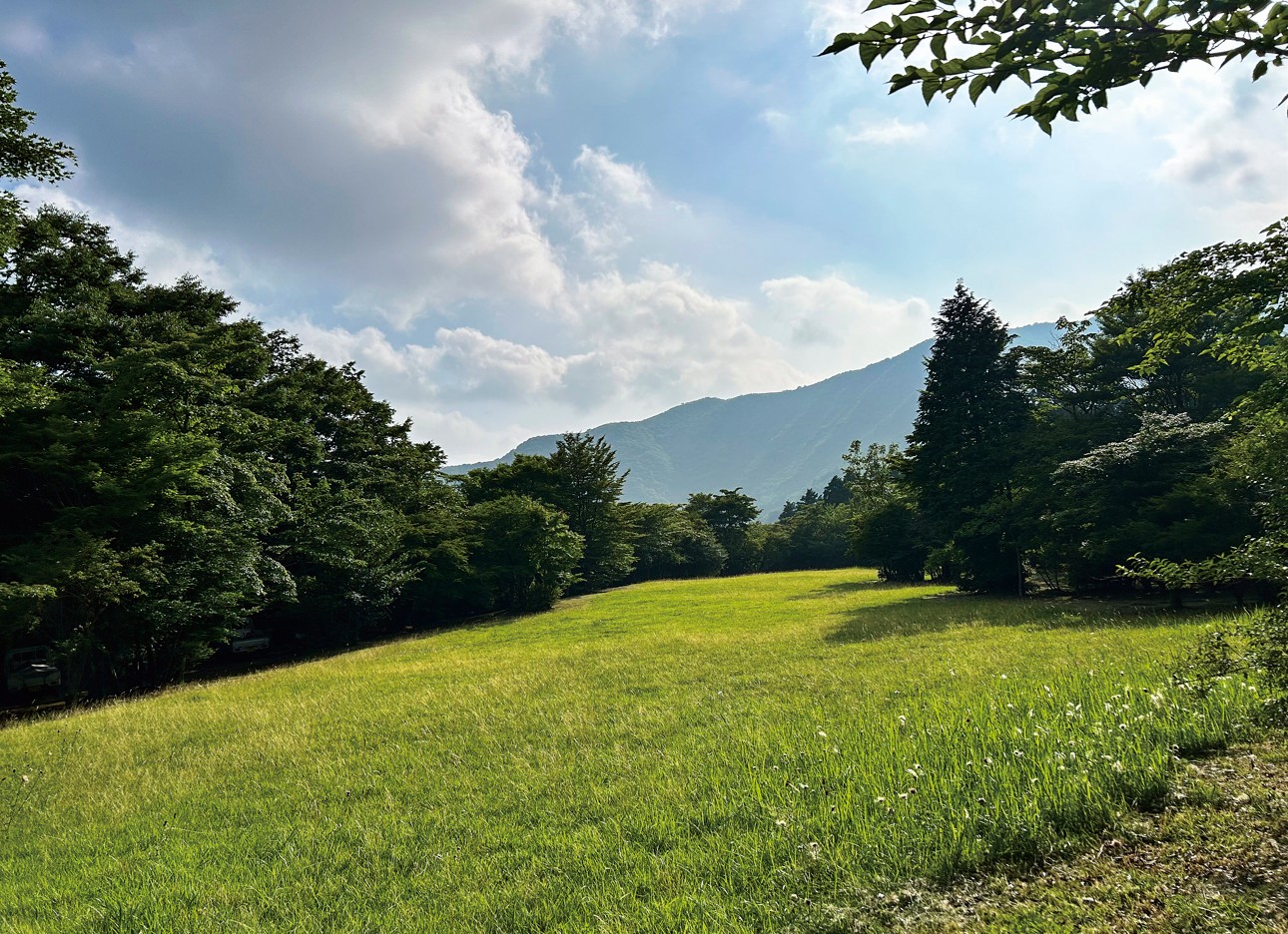 今は往時を偲ばせる建物は残っていませんが、広々とした草地には澄んだ空気が満ち、散策の途中にひと休みできる心地よい空間です。春にはヤマザクラが柔らかな彩りを添え、野草が可憐な花々を咲かせます。ベンチに腰を下ろすと、外輪山の稜線を渡る風が頬をなでてゆきます。