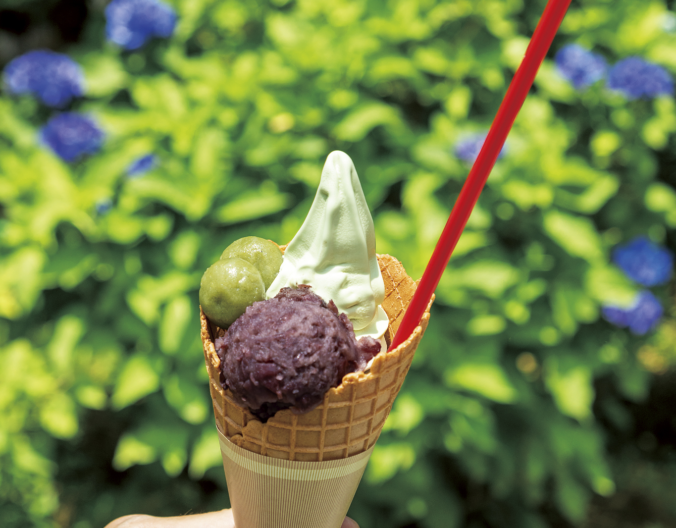 名物は、ほろ苦いよもぎを使ったソフトクリーム。まろやかな高原特濃乳の甘みと、こだわりの餡が織りなすハーモニーは至福の味わいです。「よもぎあんこだんご」や「よもぎ白玉ぜんざい」など、和スイーツも充実しています。