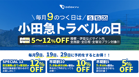 箱根・伊豆エリアなどサイト内の全宿泊施設・宿泊プランが5~12%割引!!9のつく日の午前9時から24時間限定開催なのでお見逃しなく!